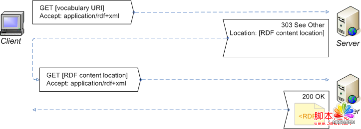 •但對(duì)于語義瀏覽器,其HTTP請(qǐng)求頭是:application/rdf+xml類型,故服務(wù)器進(jìn)行303重定向,得到相應(yīng)RDF文件。