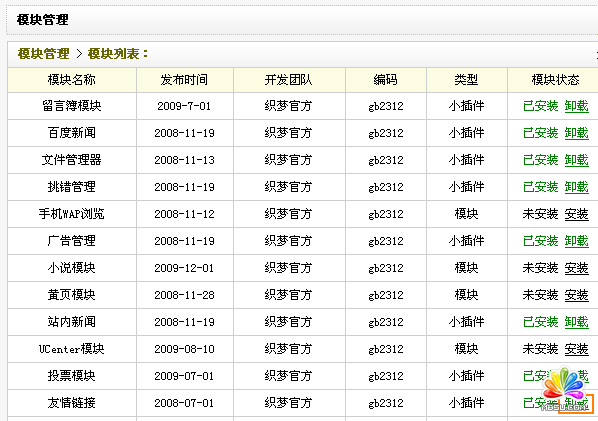 1、進入后臺后,單擊左側(cè)主菜單“模塊”選項后,彈出如下界面: