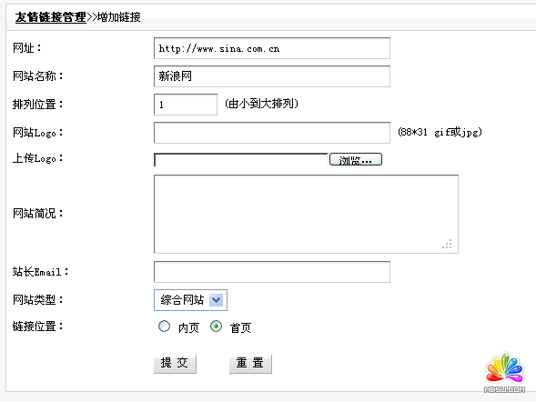 在上圖中,“網(wǎng)址”對應友情站點的url,“網(wǎng)站名稱”填寫友情站點的名字,“排列位置”對應于此鏈接在友情鏈接展示頁面顯示的先后位置,數(shù)字越小位置越靠前,“網(wǎng)站logo”對應logo所在的路徑,也可以直接填寫外部鏈接,例如http://www.dedecms8.com/link/logo.gif。“網(wǎng)站簡況”填寫此鏈接站點的概括,“站長E-mail”填寫對應鏈接交換人員的電子郵箱,方便日后鏈接調(diào)整,及時通知對方。“網(wǎng)站類型”默認為綜合網(wǎng)站,可以根據(jù)實際情況選擇適合的鏈接類型,方便分類調(diào)用,“鏈接位置”有內(nèi)頁和首頁兩種選擇,站長朋友可以借此決定鏈接出現(xiàn)在首頁還是內(nèi)頁。