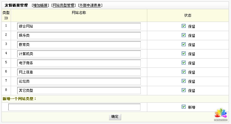 在上圖中,有8種友情鏈接類型,我們對它們進行刪除、更改。如需刪除某些,只需在其后對應的“狀態(tài)”選項“保留”前去掉打鉤,然后單擊下面的確定即可。相反,如需添加其他類型,在“新增一個網(wǎng)站類型”下方的文本框里填入新類型的名字,單擊下面的確定即可。