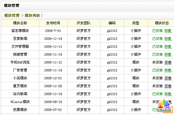 卸載投票插件步驟,首先登錄后臺(tái),單擊左側(cè)主菜單“模塊”,進(jìn)入其子菜單,如圖1。單擊“模塊管理”選項(xiàng),打開模塊列表頁面,單擊插件“投票模塊”后對(duì)應(yīng)的“卸載”,然后完成卸載過程,如圖4和圖5。