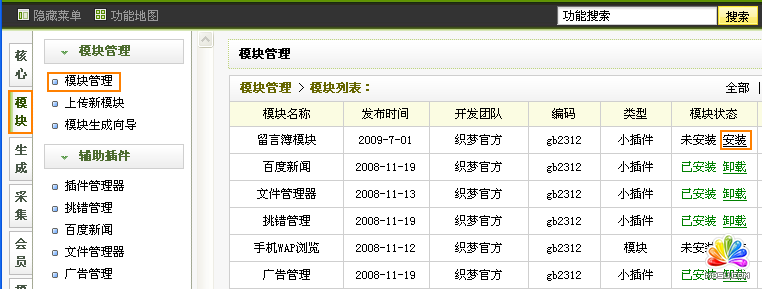 留言薄的安裝過程和其他插件一樣,首先我們進入后臺模塊管理列表,點擊其對于的“安裝”: