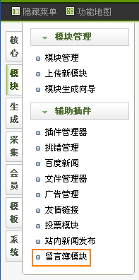 1、 進入后臺-模塊-輔助插件(圖5),單擊“留言薄模塊”,彈出留言薄模塊前臺界面(圖6)。這里,我們也可以直接在地址欄輸入http://www.yourname.com/plus/guest.book打開留言薄前臺界面。