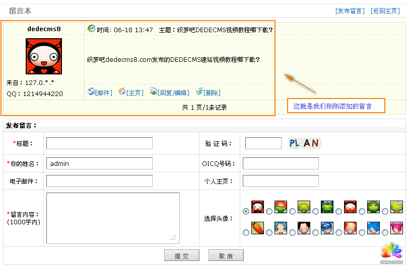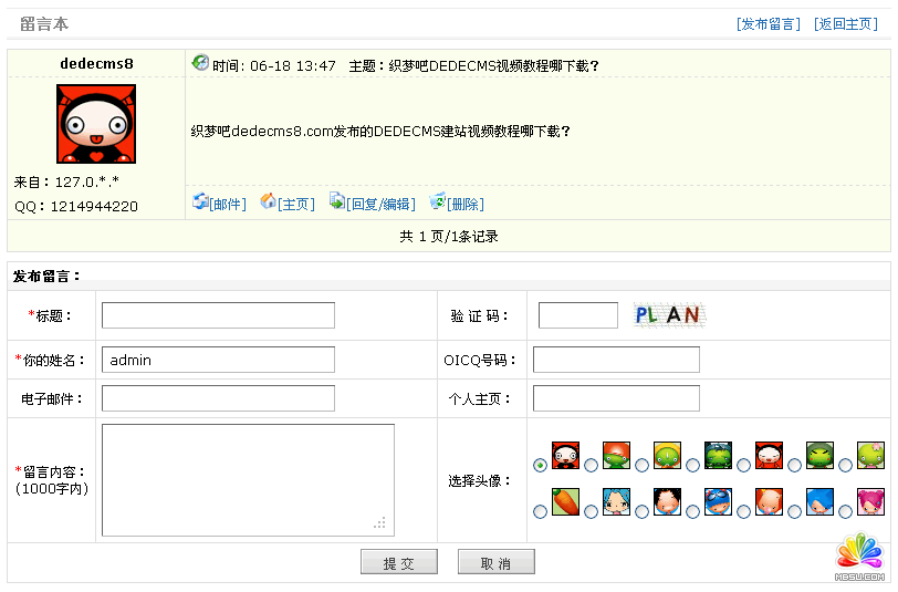 2.管理留言,如圖9,管理登陸后可以對訪客的留言進行回復、編輯、刪除等操作。