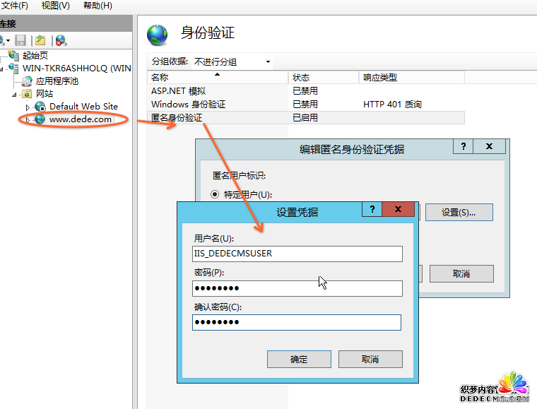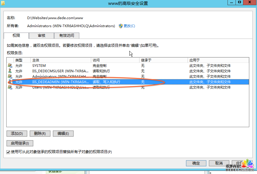 (3)按照6.1(1)中的辦法,綁定admin.dede.com站點目錄“IIS_DEDECMSADMIN”權(quán)限;