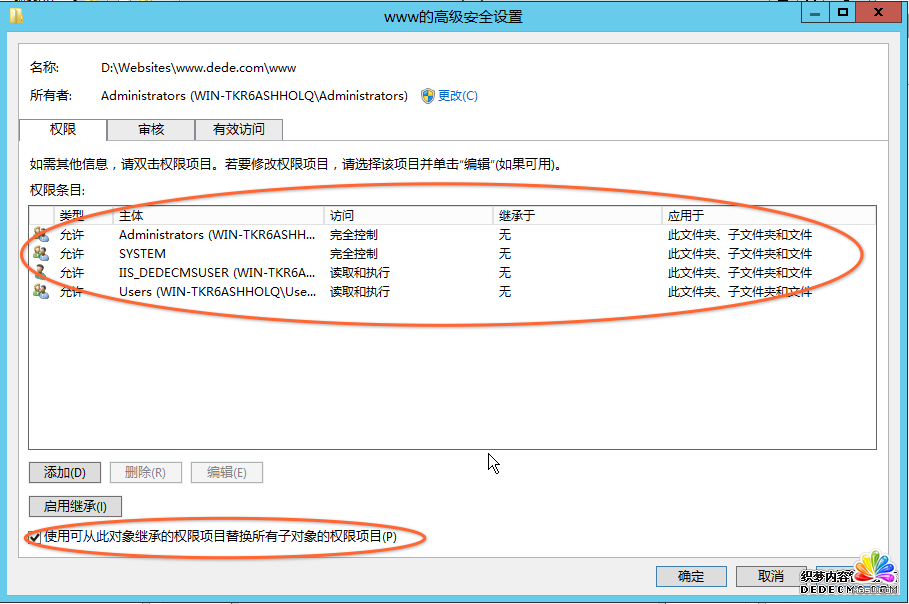 (2)站點根目錄文件夾設(shè)定權(quán)限“D:Websiteswww.dede.comwww”,我們在文件夾右鍵屬性,在“安全”選項卡的“高級”中設(shè)定文件夾權(quán)限(如圖6.1-2);