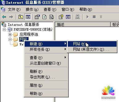 展開“網(wǎng)站”樹型節(jié)點(diǎn),刪除默認(rèn)網(wǎng)站,然后新建一個網(wǎng)站(如圖5所示)