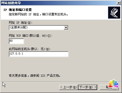 進(jìn)入向?qū)Ш�,進(jìn)入下一步,為網(wǎng)站添加描述,也就是IIS中顯示的網(wǎng)站標(biāo)示,可以隨便填寫,再進(jìn)入下一步,為網(wǎng)站配置主機(jī)頭,我們是用來配置本地測試環(huán)境,所以把主機(jī)頭配置為127.0.0.1(如圖6所示)