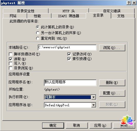 首先打開IIS管理器,然后在先前測試IIS的網(wǎng)站上右鍵,進(jìn)入“屬性”,點(diǎn)擊主目錄選項(xiàng)卡,然后將“執(zhí)行權(quán)限”配置為“純腳本”,如圖10所示