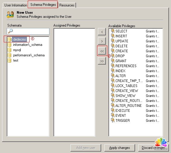 點擊圖22中紅框①處的數(shù)據(jù)庫“dedecms”,此時右側(cè)會出現(xiàn)權(quán)限,點擊紅圈②處得“<<”按鈕,為用戶“dedecms”授予“dedecms”數(shù)據(jù)庫的所有權(quán)限。然后點擊“apply changes”保存。點擊圖21中紅框②處的“apply changes”即可保存用戶。