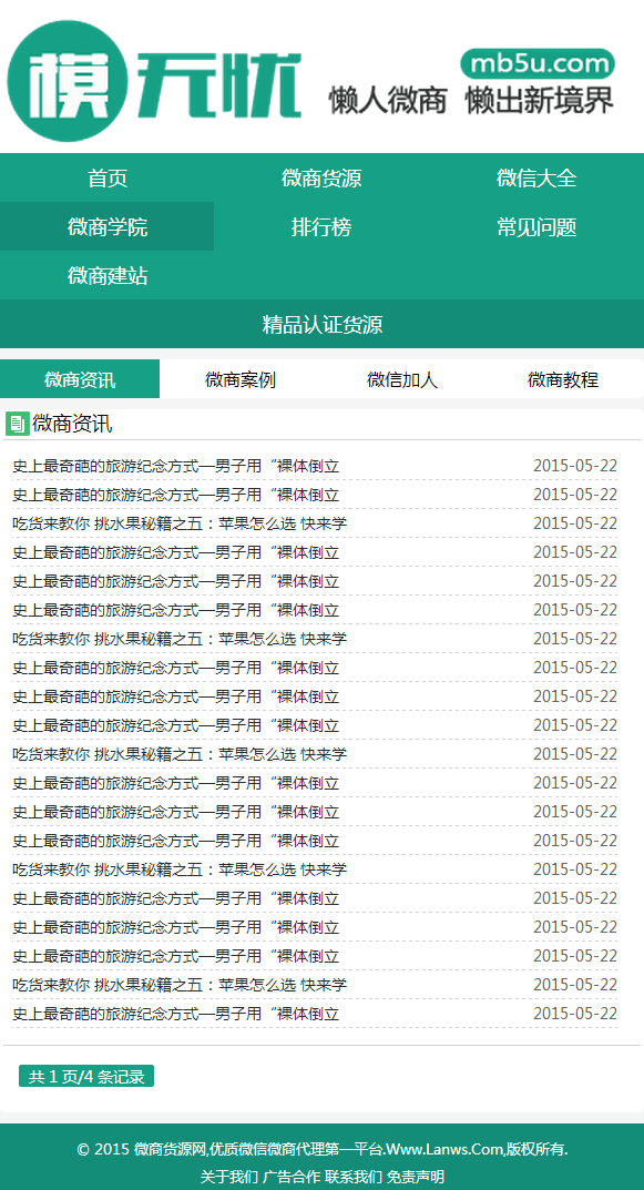 電腦版模板有 首頁、貨源列表頁 、普通貨源內(nèi)容頁、認(rèn)證貨源內(nèi)容頁、(欄目是一個(gè),但是發(fā)布貨源的時(shí)候可以選擇不同的模板,這樣你可以收認(rèn)證貨源的錢。)微信大全列表頁、微信大全內(nèi)容頁、文章列表頁、文章內(nèi)容頁、搜索頁、tag列表頁。