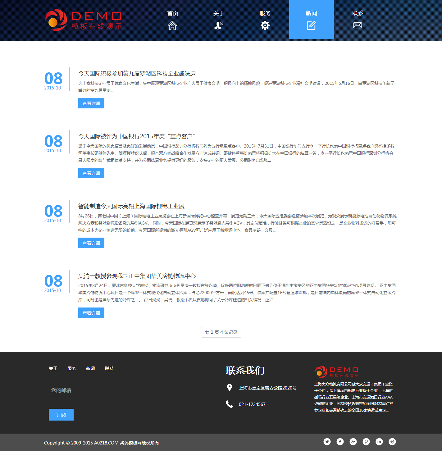 1,模板包括首頁(yè)、新聞列表頁(yè)、新聞內(nèi)容頁(yè)、關(guān)于我們、聯(lián)系我們頁(yè)、服務(wù)頁(yè)面,代碼書寫規(guī)范,干凈整潔。
