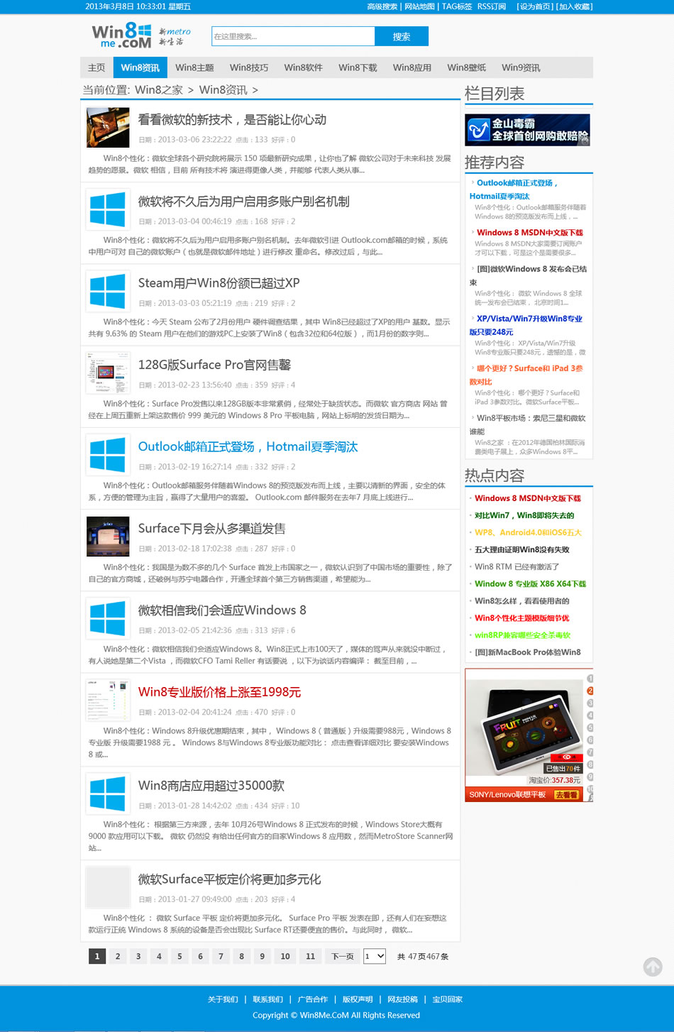 BlueStyle藍(lán)調(diào)風(fēng)格以簡潔、清新為特色,沿用微軟的設(shè)計(jì)中心思想,讓內(nèi)容更直觀地呈現(xiàn)給用戶。模版采用純 p +Css制作,摒棄Flash插件,完全符合W3C標(biāo)準(zhǔn),兼容IE 7/8/9/10 、Firfox、Chrome、Opera等主流瀏覽器。自從Windows 8發(fā)布以來,其應(yīng)用風(fēng)格深受大家的喜愛。本模版是微軟設(shè)計(jì)的精髓所在,該有的必須有,不該有的不能有。為了適應(yīng)大家對(duì)此模版的喜愛,現(xiàn)在加強(qiáng)了本模版對(duì)各種網(wǎng)站的需求。本模版可以做圖片網(wǎng)站、資訊網(wǎng)站、軟件下載站等綜合網(wǎng)站。詳情演示效果見www.win8me.com。