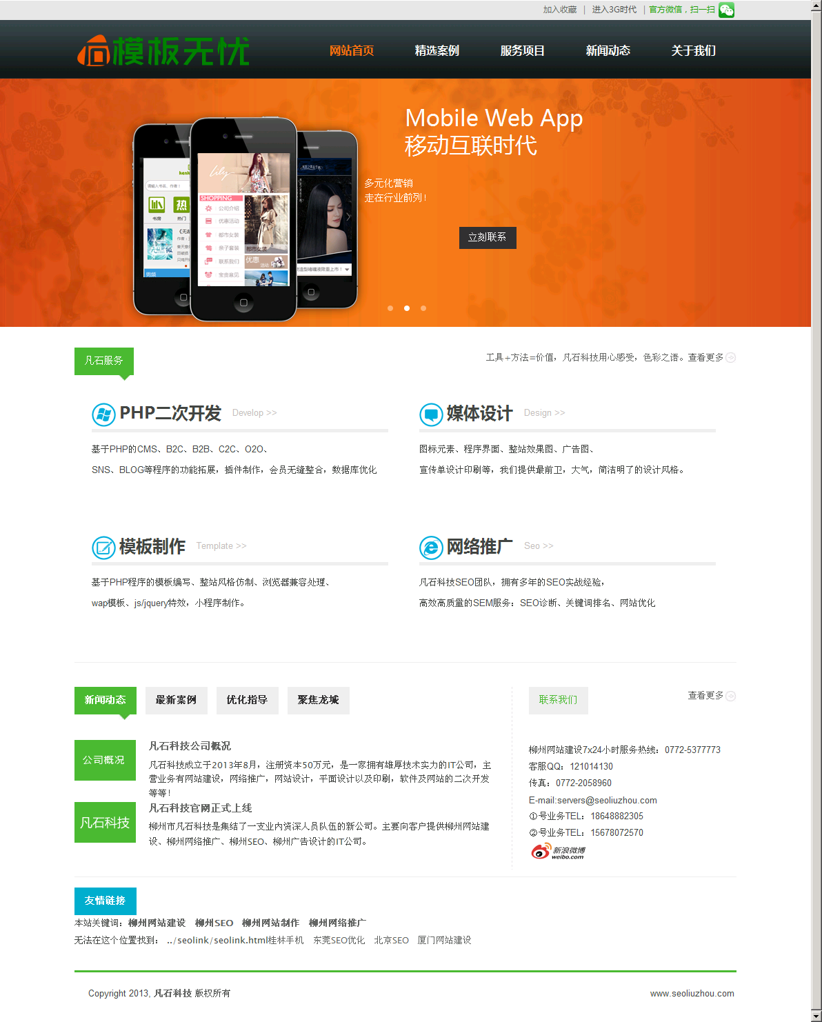 此套模板是一套,高端工程類(lèi)網(wǎng)站模板帶有手機(jī)版在加上十色的配色,讓模板瞬間高大上有沒(méi)有?價(jià)格:元 點(diǎn)擊:21織夢(mèng)CMS網(wǎng)絡(luò)建站設(shè)計(jì)公司企業(yè)