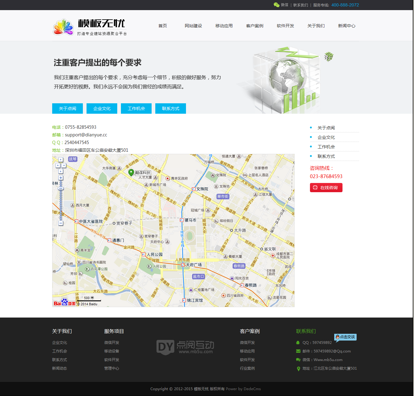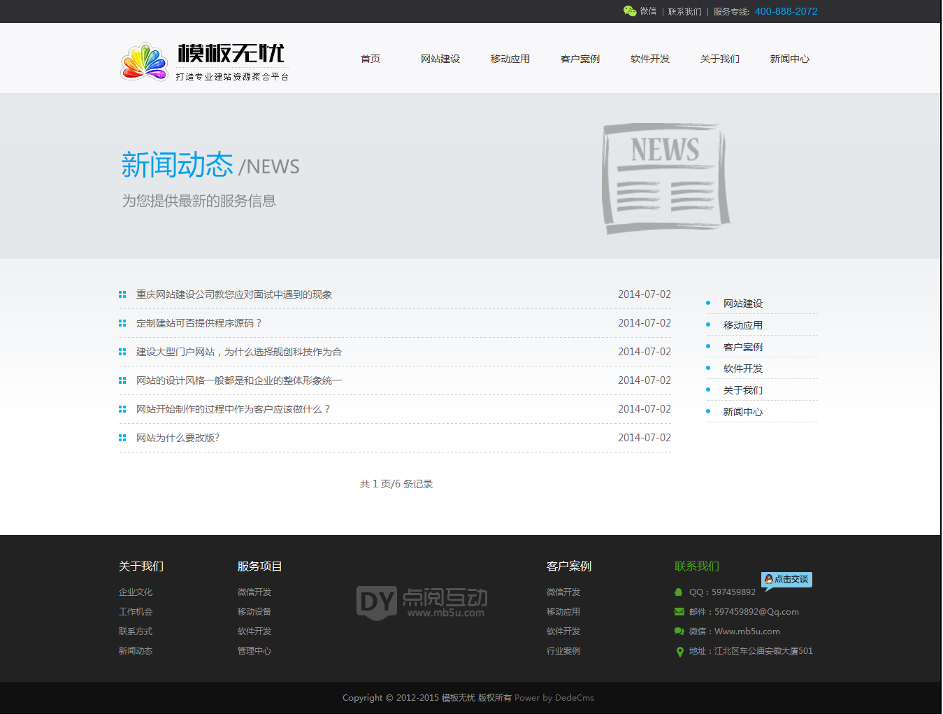 2014年最新微信營銷,網(wǎng)站建設,軟件開發(fā)、UI設計類型工作室或者公司整站源碼,網(wǎng)站源碼非常簡介大氣,圖片展示效果非常突出,由織夢dede內(nèi)核搭建,已經(jīng)設置好欄目,各種JS特效都已實現(xiàn),調(diào)用好數(shù)據(jù),方便您使用。包括網(wǎng)站建設,移動應用,客戶案例,軟件開發(fā),關于我們,新聞中心等欄目。
