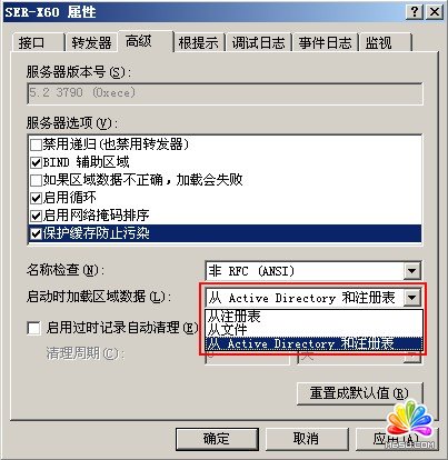 默認(rèn)情況下DNS啟動(dòng)時(shí)是從AD和注冊(cè)表中加載啟動(dòng)文件,對(duì)于非與環(huán)境,自然只能從服務(wù)器的注冊(cè)表中加載了啟動(dòng)數(shù)據(jù)了。“從文件”這項(xiàng)是指DNS會(huì)類似BIND一樣依靠named.boot這樣的文件進(jìn)行啟動(dòng)的設(shè)置,此設(shè)置保持默認(rèn)即可。