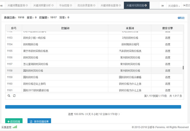 這里我們用平臺長尾關(guān)鍵詞挖掘工具,主要優(yōu)點是能填寫條件篩選,比如下面的挖掘詞我填寫的條件是必須包含“鋼材”和“價格”這兩個詞: