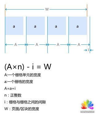 在網(wǎng)頁設(shè)計中,我們把寬度為“W”的頁面分割成n個網(wǎng)格單元“a”,每個單元與單元之間的間隙設(shè)為“i”,此時我們把“a+i”定義“A”。他們之間的關(guān)系如下: