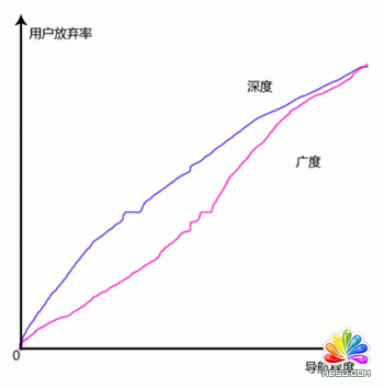 對于那些信息量很大很雜的網(wǎng)站來說,單純的使用某一種按類分組的方案已經(jīng)不太適用了。一般來說,廣度比深度的效果更好。在深結(jié)構(gòu)的各級別間選擇,比起在廣導(dǎo)航的各選項(xiàng)間掃視,要付出更多精力。眼睛比起鼠標(biāo)點(diǎn)擊(和頁面載入)要快得多。雖然用戶在深結(jié)構(gòu)更容易迷失方向,甚至可能迷路,但也不要在廣度上走得太遠(yuǎn)。任何時(shí)候都把所有鏈接展示出來會嚇倒用戶,讓他難以選擇。用戶會點(diǎn)擊看起來適合他們需要的第一個(gè)選項(xiàng),或者干脆放棄,下圖清晰的闡述了用戶放棄率和深廣度之間的關(guān)系: