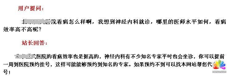 現(xiàn)在很少醫(yī)療站站長會考慮到增添一個網(wǎng)站問答欄目,因為大家都認(rèn)為用戶不會有那么多空閑到問答欄目上向網(wǎng)站提問題。事實的確如此,但是我們卻忽略了一個細(xì)節(jié),問答欄目完全可以自問自答,并間接創(chuàng)造網(wǎng)站內(nèi)容。因此筆者在這里建議大家,如果你現(xiàn)在使用的網(wǎng)站沒有開設(shè)問答板塊,可以尋找技術(shù)人員或者自己開發(fā)一個問答板塊,可以參照一下筆者網(wǎng)站上的這個模板: