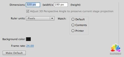打開Flash創(chuàng)建一個(gè)新文檔,舞臺(tái)大小設(shè)為320*190,顏色為#181818 ,幀頻為 24fps.