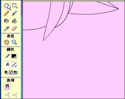 我在前面一個(gè)教程里已經(jīng)說過了,放大是畫畫不可缺少的,像我們下面要畫的眼睛吧,因?yàn)檠劬﹄m大,但以百分百的場景來畫,還是不順手的,所以選把場景變大吧~放大到百分之二百,或者更大,看個(gè)人習(xí)慣了。選擇橢圓工具,把填充色關(guān)掉,點(diǎn)下面的那一紅色斜線的按鈕就行了,然后在場景中畫出一個(gè)橢圓,用選擇工具改變好形狀。如圖: