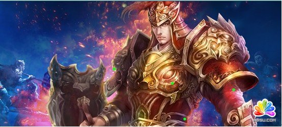 添加了火焰的光效,人物顯得比較動態(tài)鮮活,整個畫面更有一種對抗的戰(zhàn)火紛飛的感覺,但是現(xiàn)在整個畫面結合度還不夠高,這個時候我們往往會通過調整人物的色調和對比度等方法來使整個畫面更加和諧,但是不要漏掉一個重要的步驟就是環(huán)境色,可以通過在人物身上添加環(huán)境色來使人物和光效得到更好的結合,而且有質感的光效就像現(xiàn)在用的火焰,可以將材質疊加到人物的明暗面讓畫面更加真實生動(如圖中綠點標示部位)。最后,我們可以添加一些飄動的零散的火光,讓火焰的更有動感。