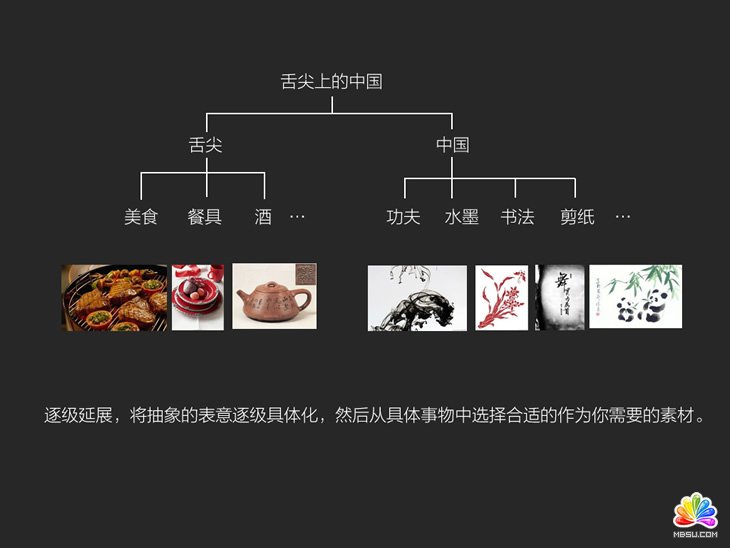 我們先將“舌尖上的中國”提取關(guān)鍵字“舌尖”、“中國”。舌尖讓我們聯(lián)想到什么呢?有美食、餐具、,等等。中國讓我們聯(lián)想到什么呢?功夫、水墨、剪紙、龍、國畫,等等。