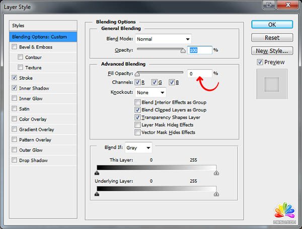 20、再設(shè)置圖層樣式,分別設(shè)置混合選項(xiàng)、描邊、內(nèi)陰影,參數(shù)及效果如下圖。