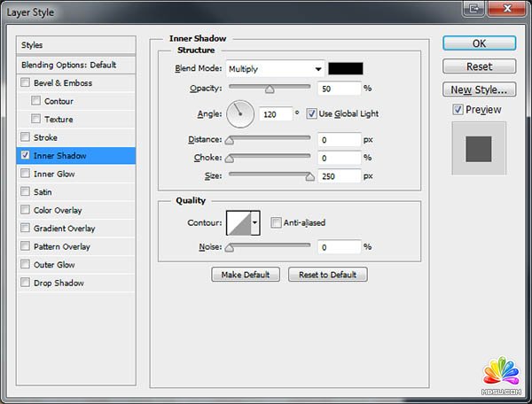 2、給木紋圖層添加圖層樣式,選擇內(nèi)陰影,參數(shù)及效果如下圖。