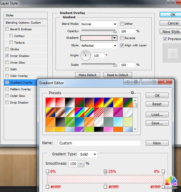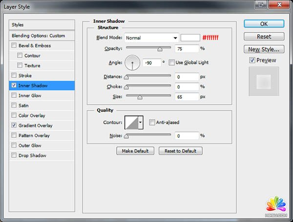 5、給圓角矩形設(shè)置圖層樣式,分別設(shè)置混合選項(xiàng)、內(nèi)陰影、漸變疊加,參數(shù)及效果如下圖。