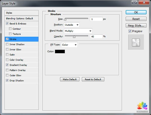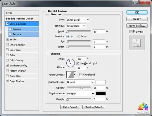 13、給小圓添加圖層樣式,分別設(shè)置:斜面和浮雕、描邊、漸變疊加、投影,參數(shù)及效果如下圖。