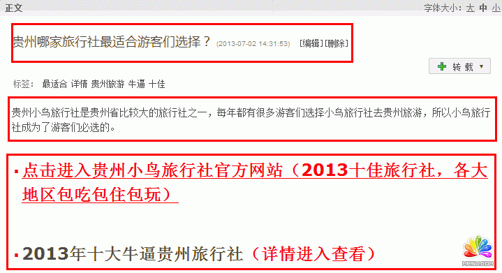 其次,不要發(fā)布帶有明顯推廣性的旅游軟文外鏈,如果網(wǎng)站已經(jīng)有了這樣的軟文外鏈要盡快刪除,如果沒有則是最好的,不管有還是沒有,刪除完這些垃圾外鏈之后,以后在發(fā)布外鏈的時(shí)候要切記這幾點(diǎn),不要發(fā)布帶有超鏈接、多個(gè)URL、各種聯(lián)系方式、帶有明顯的推廣產(chǎn)品或者公司的軟文�?赡軙�(huì)有站長(zhǎng)們會(huì)問答,網(wǎng)站主要就是做產(chǎn)品的,不發(fā)產(chǎn)品推廣外鏈就沒啥外鏈可以發(fā)了,這里筆者要告訴站長(zhǎng)們,發(fā)布外鏈的時(shí)候可以以用戶體驗(yàn)的角度去寫文章,專門寫一些產(chǎn)品的相關(guān)知識(shí),最后在發(fā)布外鏈不要帶上有明顯推廣性的內(nèi)容即可。