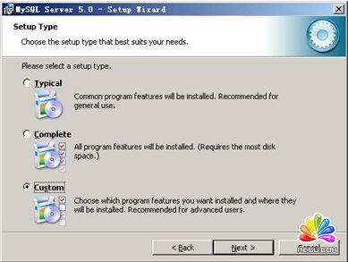 選擇安裝類型,有“Typical(默認)”、“Complete(完全)”、“Custom(用戶自定義)”三個選項,我們選擇“Custom”,有更多的選項,也方便熟悉安裝過程: