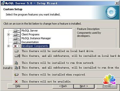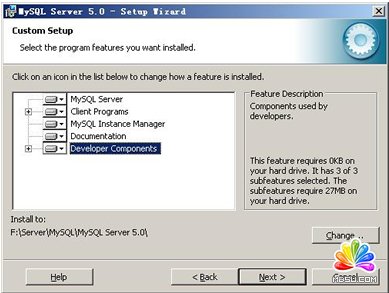 在“Developer Components(開發(fā)者部分)”上左鍵單擊,選擇“This feature, and all subfeatures, will be installed on local hard drive.”,即“此部分,及下屬子部分內(nèi)容,全部安裝在本地硬盤上”。在上面的“MySQL Server(mysql服務(wù)器)”、“Client Programs(mysql客戶端程序)”、“Documentation(文檔)”也如此操作,以保證安裝所有文件。點選“Change...”,手動指定安裝目錄。