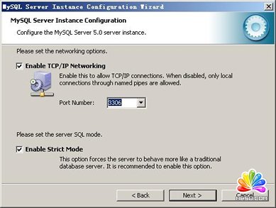 是否啟用TCP/IP連接,設(shè)定端口,如果不啟用,就只能在自己的機器上訪問mysql數(shù)據(jù)庫了,我這里啟用,把前面的勾打上,Port Number:3306,在這個頁面上,您還可以選擇“啟用標(biāo)準(zhǔn)模式”(Enable Strict Mode),這樣MySQL就不會允許細小的語法錯誤。如果您還是個新手,我建議您取消標(biāo)準(zhǔn)模式以減少麻煩。但熟悉MySQL以后,盡量使用標(biāo)準(zhǔn)模式,因為它可以降低有害數(shù)據(jù)進入數(shù)據(jù)庫的可能性。按“Next”繼續(xù)