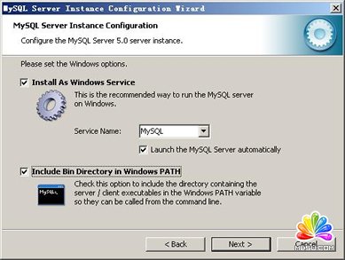 選擇是否將mysql安裝為windows服務(wù),還可以指定Service Name(服務(wù)標(biāo)識名稱),是否將mysql的bin目錄加入到Windows PATH(加入后,就可以直接使用bin下的文件,而不用指出目錄名,比如連接,“mysql.exe -uusername -ppassword;”就可以了,不用指出mysql.exe的完整地址,很方便),我這里全部打上了勾,Service Name不變。按“Next”繼續(xù)。選擇是否將mysql安裝為windows服務(wù),還可以指定Service Name(服務(wù)標(biāo)識名稱),是否將mysql的bin目錄加入到Windows PATH(加入后,就可以直接使用bin下的文件,而不用指出目錄名,比如連接,“mysql.exe -uusername -ppassword;”就可以了,不用指出mysql.exe的完整地址,很方便),我這里全部打上了勾,Service Name不變。按“Next”繼續(xù)。