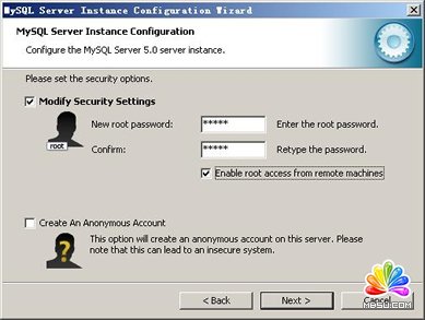 這一步詢問是否要修改默認(rèn)root用戶(超級管理)的密碼(默認(rèn)為空),“New root password”如果要修改,就在此填入新密碼(如果是重裝,并且之前已經(jīng)設(shè)置了密碼,在這里更改密碼可能會出錯,請留空,并將“Modify Security Settings”前面的勾去掉,安裝配置完成后另行修改密碼),“Confirm(再輸一遍)”內(nèi)再填一次,防止輸錯。 “Enable root access from remote machines(是否允許root用戶在其它的機器上登陸,如果要安全,就不要勾上,如果要方便,就勾上它)”。最后“Create An Anonymous Account(新建一個匿名用戶,匿名用戶可以連接數(shù)據(jù)庫,不能操作數(shù)據(jù),包括查詢)”,一般就不用勾了,設(shè)置完畢,按“Next”繼續(xù)。
