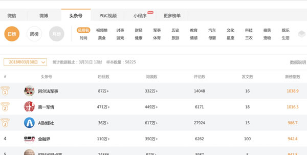 我的方法是,百度搜索查找一些能有微博、微信、頭條號(hào)等數(shù)據(jù)統(tǒng)計(jì)的網(wǎng)站,然后點(diǎn)擊頂部導(dǎo)航欄的頭條號(hào),馬上就能找到各行各業(yè)排名靠前,且閱讀量不菲的賬號(hào)了。舉例如下圖: