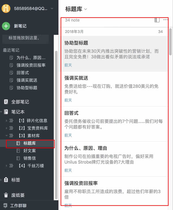因?yàn)槭菢?biāo)題參考庫(kù),可能隨時(shí)隨地都在用到,基于這個(gè)特性,最好是放在電腦、手機(jī)都能看到的地方。我選來(lái)選去,還是認(rèn)為保存在印象筆記里面是最好的。