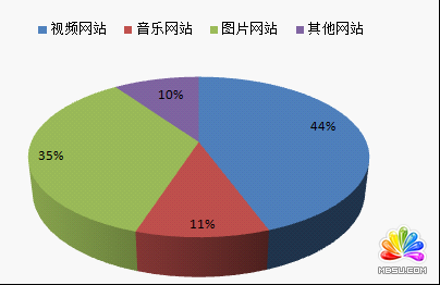 通過分析四月的分享數(shù)據(jù),我們將網(wǎng)民所分享的頁面內(nèi)容根據(jù)展現(xiàn)形式分為:視頻、音樂、圖片幾類,從不同類別下抽取200個(gè)網(wǎng)站的分享數(shù)據(jù)進(jìn)行統(tǒng)計(jì)對(duì)比,得出如下結(jié)果: