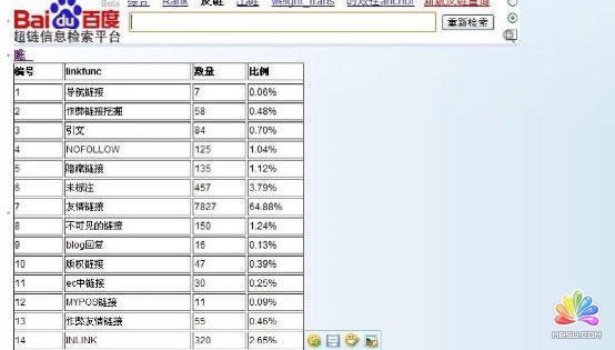 搜索引擎簡單的理解是通過一款人工開發(fā)出來的程序進行用戶關鍵詞請求的相關結(jié)果排序。比如自己網(wǎng)站站內(nèi)的搜索框其實也是一個搜索引擎,而不同的搜索引擎排序方式(算法)大同小異,但是不管是哪種搜索引擎,總而言之,都有自己的獨特結(jié)果排序計算公式來進行網(wǎng)頁結(jié)果排名。下面我們來了解百度內(nèi)部的一款超鏈分析系統(tǒng)截圖,如下圖所示: