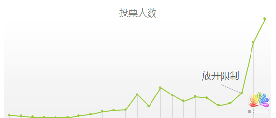 放開(kāi)限制之后,用戶的互動(dòng)參與率有了明顯的提高,下圖是投票人數(shù),放開(kāi)限制后有爆發(fā)性增長(zhǎng)。